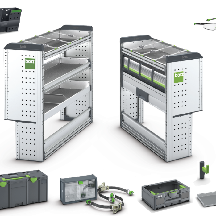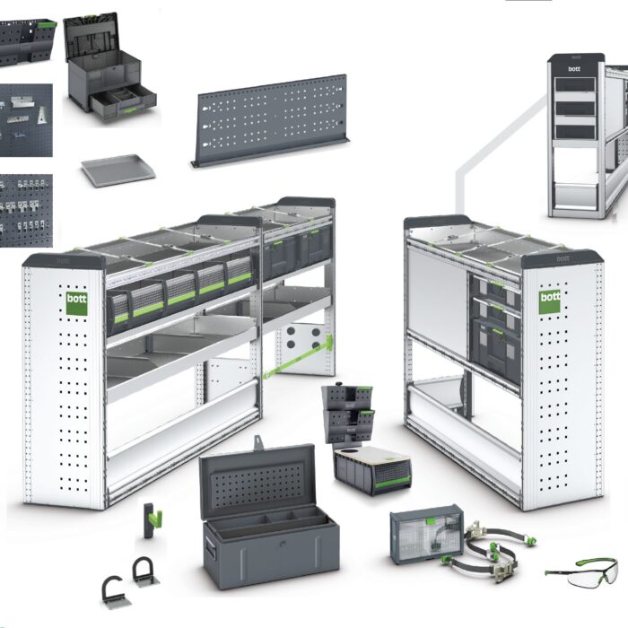 La modularité unique de bott vario3 offre un large éventail d’options pour étendre les packs de démarrage et les adapter précisément à vos besoins. Les établis pliables avec étaux, les longs plateaux à marchandises ou les porte-bouteilles de gaz ne sont que quelques exemples. Votre interlocuteur vous propose également des solutions pour la configuration de base de votre véhicule avec revêtement mural intérieur